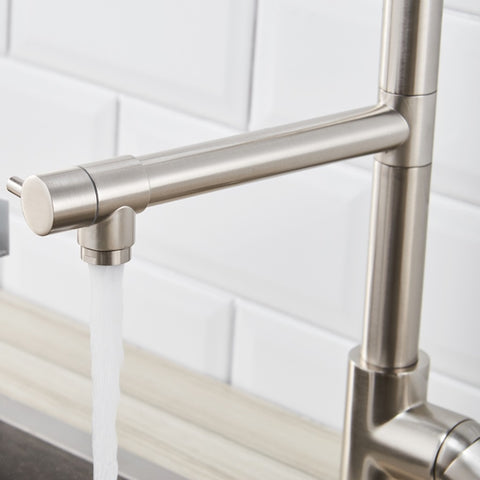 About this item High Quality- FLG kitchen faucet is constructed by all brass material, not zinc alloy, lead free, superior corrosion and rust resistant. Stainless steel kitchen faucet with brushed nickel finish resists water spots and fingerprints, looking clean and beautiful. Heavy Duty Design -- FLG commercial kitchen faucet, with the combination of contemporary industrial style and sophistication, perfectly fits for your kitchen makeover. Suitable for big sink or granite counter top; Dual Function -- Kitchen Faucets with Pull Down Sprayer and Pot Filler spout, they can work at the same time with their own control in two sinks. For the sprayer, there is a clip to keep it on spray hands free, offering a powerful spray to do washing; the pot Filler provides aerated stream to fill large pots and pans. Single Handle Design-- this pull down kitchen faucet can swivel around 360 degrees for full sink access, both the sprayer and pot filler spout can 360 degree swivel. Care and Clean