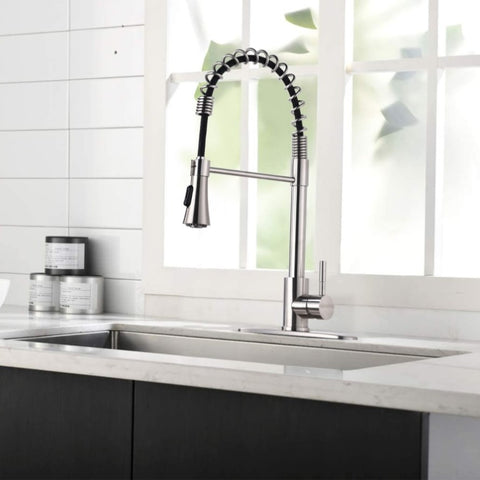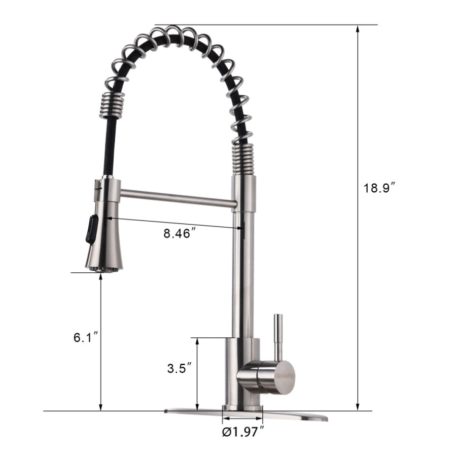 Made of stainless steel and boasting a corrosion-resistant finish, the spring faucet will be a lasting addition to your home. 360 Degree Swivel Pull Down Sprayer provide a full range of motion so you can wash your dishes from any angle. Its dual-function sprayer switches seamlessly from an aerated stream to powerful rinse at the push of a button,making this fixture ideal for a variety of tasks.