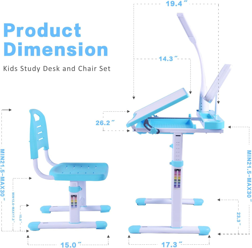 | Chair Size 15.0" x 15.0" x 21.3"-30" | Package Included 1 x Adjustable Height Desk; 1 x Adjustable Height Chair; 1 x Eye-Care LED Lamp; 1 x Reading Book Shelf; 1 x Small Toy Bucket; 1 x Bag Steel Hook; The Required Install Accessory Kit. |