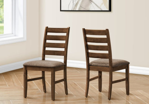 These durable side chairs are elegantly upholstered in a brown fabric with solid wood legs and a ladder back design for support with fashionable style.