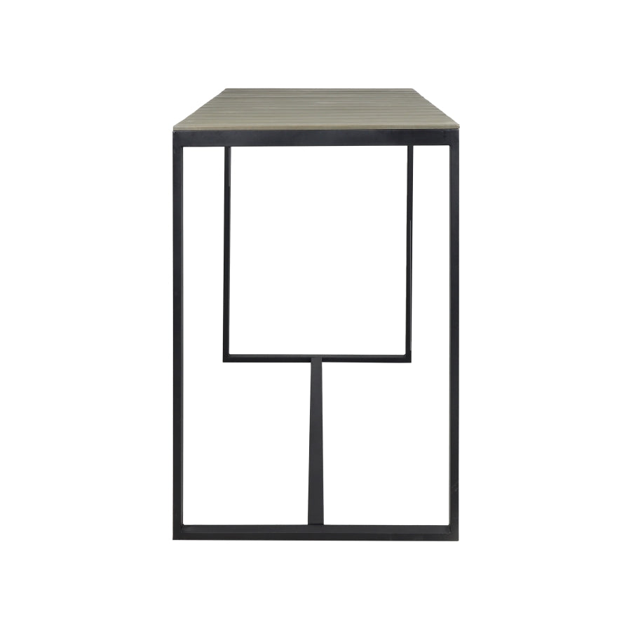 MODERN INDUSTRIAL: Our bar table incorporates a powder-coated frame with sleek wooden slats to create an understated modern industrial design. Featuring smooth metal contrasted by natural wood, this table offers a chic aesthetic to any outdoor space.