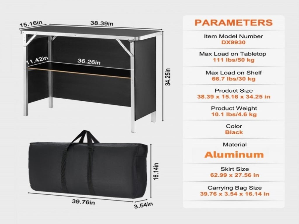 Folding Portable Bar Table with Carrying Case, Storage Shelf, and Black Skirt, 38.39" x 15.16" x 06288849