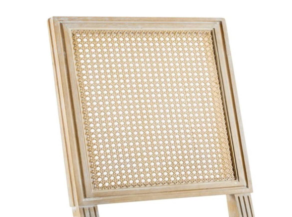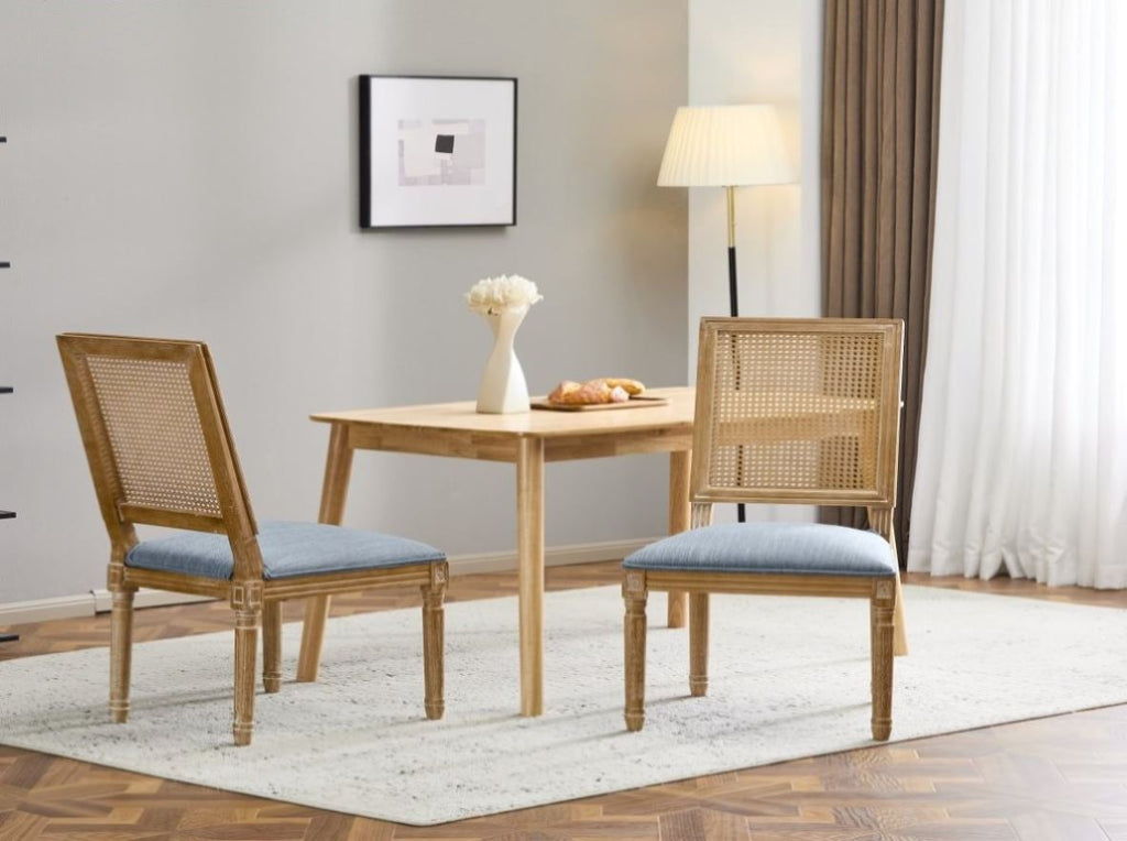 FRENCH COUNTRY INSPIRATION: Meticulously designed with a touch of sophistication, these chairs transform your dining space into a work of art. Inspired by French country aesthetics, the set of two dining chairs showcases a sleek rectangular cane backrest, elegantly upholstered seats, and slender fluted legs. This unique combination adds a distinctive charm to your home while staying true to its timeless, vintage elegance.