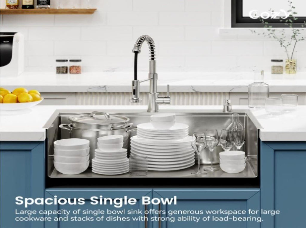 HANDCRAFTED KITCHEN SINKS: Features with HANDMADE craftsmanship, made of 18-gauge, 304-grade brushed stainless steel, the thickness is uniform and the texture is better. It will not cause the sink to be too thin like stretched sinks. Longer service life. A brushed satin finish tends to hide water spots. The flawless, smooth texture and golden ratio R10 rounded corners make it more aesthetic, and functional.