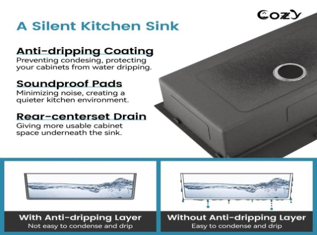 X-SHAPED DIVERSION DESIGN: The bottom of the sink adopts a scientific X-shaped diversion design which makes it fast, and effectively drain off water. EFFECTIVE NOISE REDUCTION: The outer side of the sink's bottom is not only covered with sound-dampening pads but also sprayed with damp-proof paint coating to achieve the effect of noise reduction and moisture absorption, making the sink quieter to use and reducing condensation at the bottom of the sink.