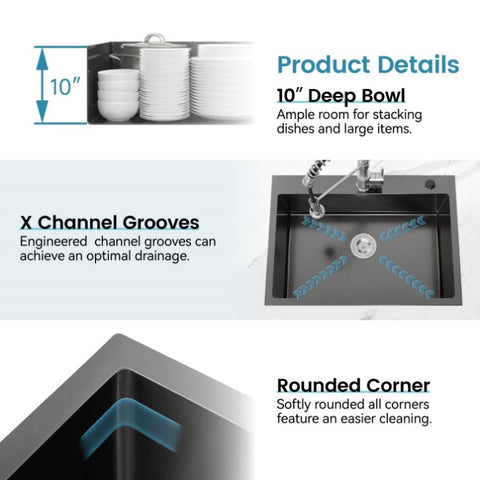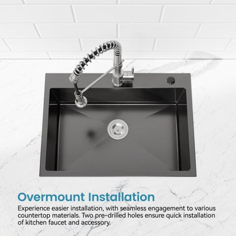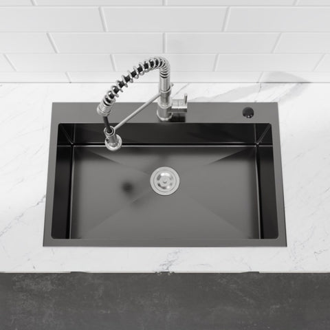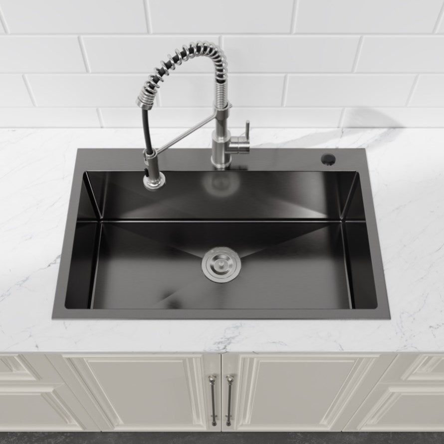 Kitchen Sink, 30x19 Single Bowl, Overmount Handmade Sink in Black, with US Standard Drain and 09418376