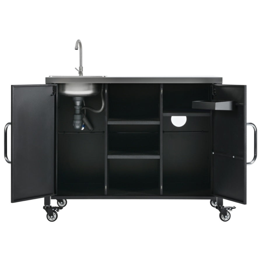 | Highlights | [Ample Storage Space][Modular Design][Robust Heavy-metal Frame] [304 Stainless Steel Freestanding Sink][Door Storage Shelf] [4*360°Smooth 3” Large Lockable Rubber Wheels][Removable& Adjustable Shelf] [Towel Rack][Paper Rack][4 “S” Hook Hanger][Large Spice Rack] [Bottle Opener][Propane Tank Line Hole ][Open Shelf in the Middle] |
