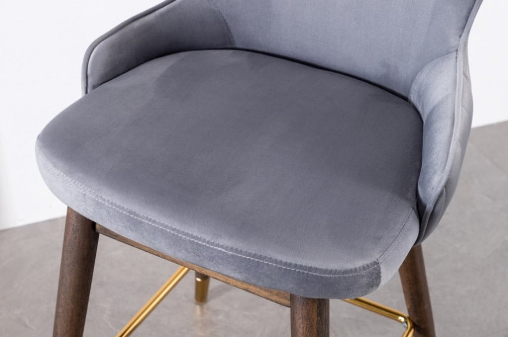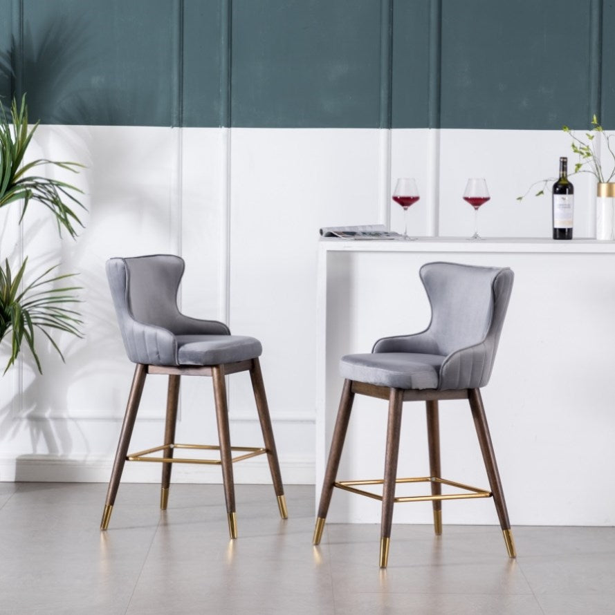 Set includes two counter height stools. Thick layers of dense foam are used to pad the backrest and seat, upholstered with a lush velvet-like fabric in your choice of color