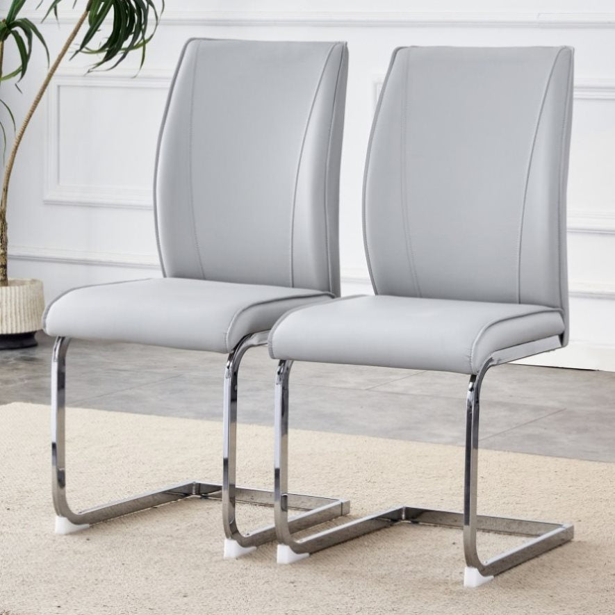 Luxury Simple Design: This light gray dining chair features an arched design with smooth lines and a unique shape, adding a touch of fashion to your dining area.Arched Metal Silver Leg Design: The unique arched metal silver legs not only provide stable support but also add a modern and industrial style, making the dining chair a fashionable focal point in the dining area.