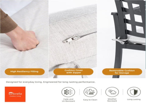 The cushion fabric is made from high-quality Sunbrella fabric in Cast Silver color, offering exceptional durability and strong weather resistance, making it perfect for outdoor use. The cushions are removable, filled with high-density foam, and feature a zipper, making them easy to remove and clean for convenient maintenance.