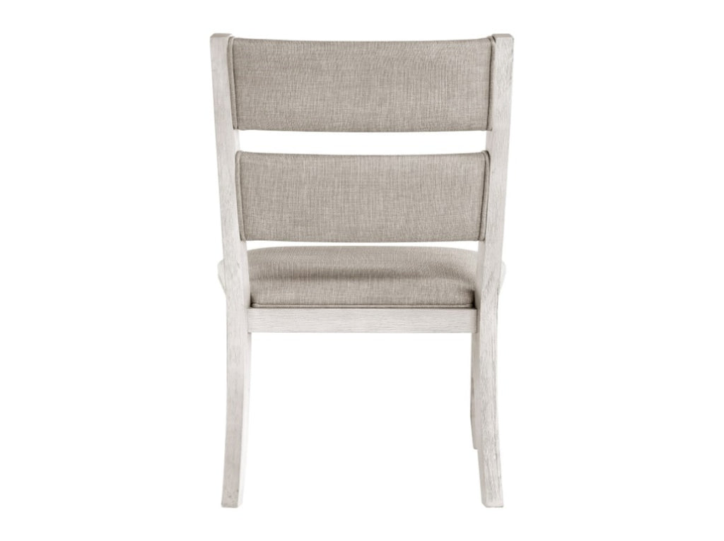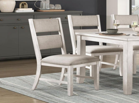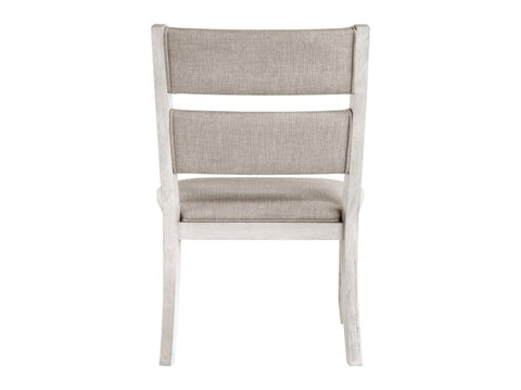 Enhance your dining room's charm with this beautifully styled side chair, which perfectly captures the sought-after contemporary farmhouse aesthetic. Constructed with a durable wood frame and finished in a distressed brushed antique white finish, this chair provides a sturdy yet elegant seating solution. The seat is upholstered in a comfortable, easy-to-match light gray textured fabric, offering both durability and a soft feel. With a robust 250lbs weight capacity, this chair is ideal for daily family use and entertaining guests, blending classic design with reliable, comfortable seating.