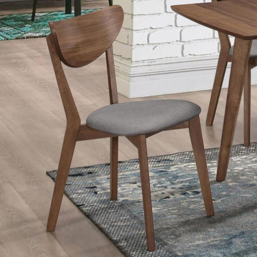 Rounded curves and angled lines highlight this set of two mid-century modern dining chairs. Each chair is finished in a warm natural walnut hue and is crafted with a rounded back for support and a grey upholstered seat for comfort, coming together to offer a stylish coziness that will make long conversational dinners pass by with ease