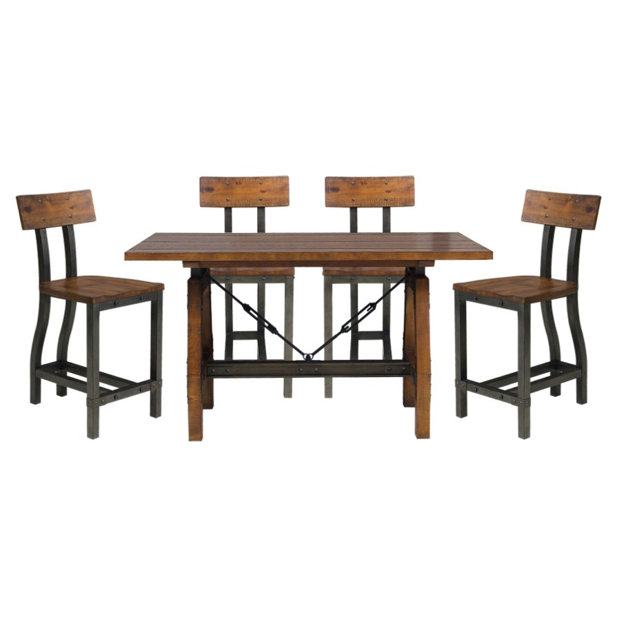 Heavily influenced by industrial design, the Holverson Collection will lend a unique look to your personal space. Gunmetal finished wood framing provides sturdy structure and profile to the counter height table. Faux rivets provide additional detail to the metal bracketing that is prominently on display. Fixed-top counter height table allows for perfect placement within your casual dining space. A rustic brown milk crate finish is utilized to highlight the acacia veneer.