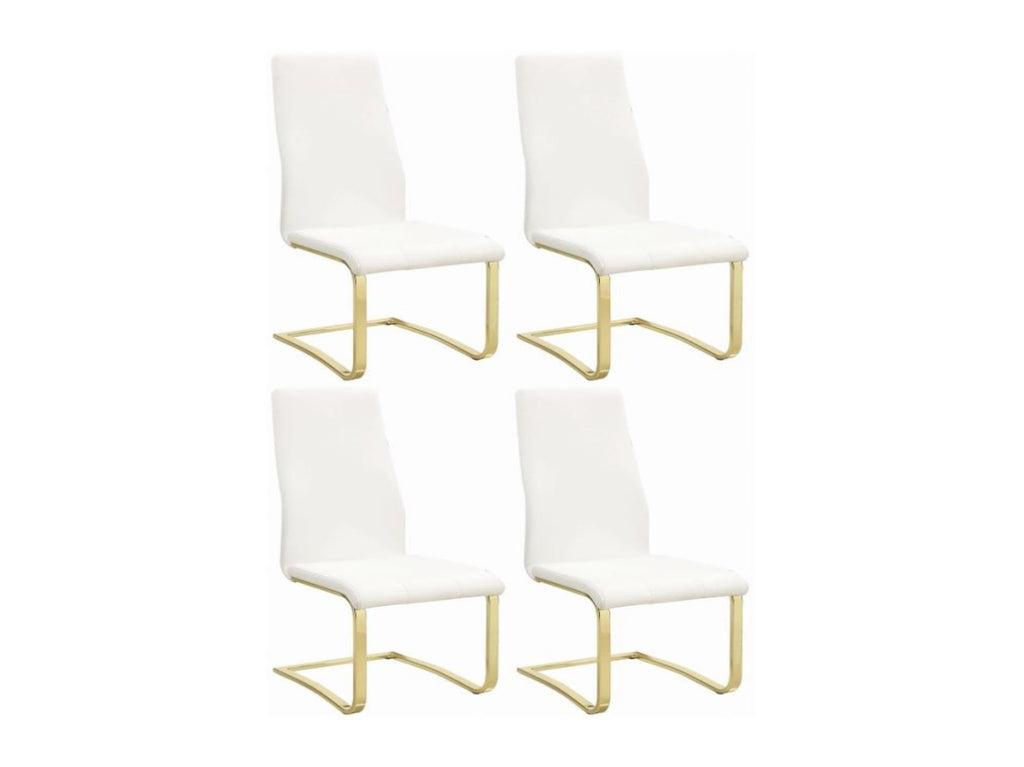 Smooth and clean, this armless dining chair adds a crisp feel to any dining room. Perfect for a bright or bold space, the L-shape legs feature a radiant gold finish. An elongated seat back tapers slightly, giving this chair its elegant personality. Soft white cushioning is dressed up with smooth seams down the seat. Create the illusion of open space with the statement-making brilliance of crisp color and metallic shine.