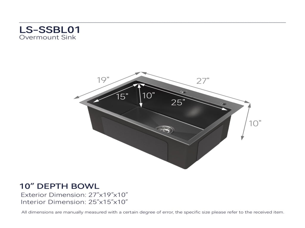 Stainless Steel Kitchen Sink, 27x19 Single Bowl, Overmount Handmade Sink in Black, with US 00233658