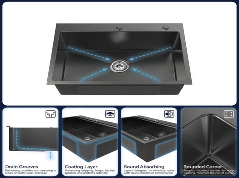 Black Finish: Modern, minimalist, and stylish. Add a touch of sophistication to any home decor. Resistant to stains and fingerprints, keeping your sink clean and sleek.