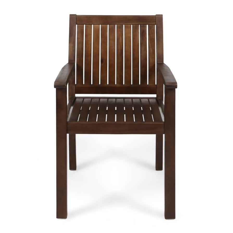 Contribute to your rustic, timeless outdoor dining space with this stylish pair of dining chairs. The classic design promises texture and charm in the form of a slatted design and beautiful acacia wood construction. Hints of farmhouse, modern, and rustic design make these chairs a unique choice. Use these sophisticated chairs as stand-alone seating, or pair them with a matching table for a cohesive and coordinated look. Add a couple more seats around your beautiful table with these charming chai