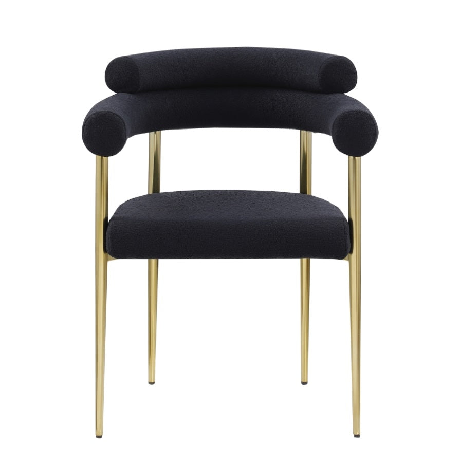 This 2-piece set of armchairs brings a contemporary look to your living room or dining room. Tiered rolled arms that curve around and form a dynamic back. Plush fabric upholstery and filled with foam provide extra comfy. Crafted from iron, and blend fabric, this chair is both sturdy and cozy. Brushed bronze metal frame provides foundational support and features a contemporary silhouette that perfect for any modern living space.