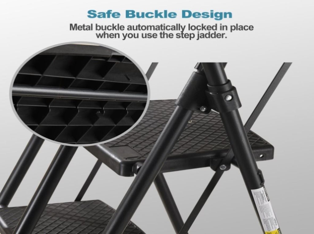 SECURITY AND STABILITY: High-grade steel frame is constructed with strength and reliability. The back cross brace structure reinforce the basic support which will make you feel more safe climbing up the step ladder.