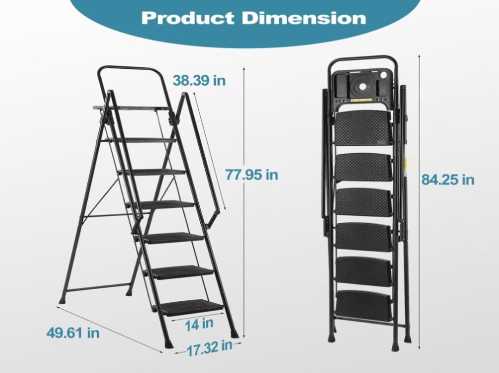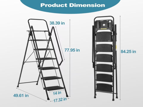 NON-SLIP PROTECTION: The 6 step ladder has non-slip handgrip making the stool easy to climb and carry. Wide pedals with non-slip rubber pattern offer heel-to-toe foot support. The thickened rubber ladder feet fully contact the ground and the comfortable handgrip design enhances the safety and stability of the ladder.