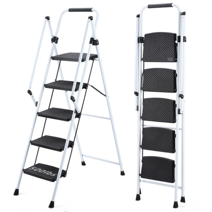 Ergonomic ladder: the high-strength steel frame structure is firm and reliable, and the four anti slip pads have strong traction, allowing you to easily climb the steel ladder stool, while still providing you with good support and security