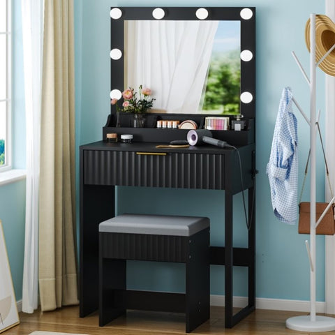 This elegant and functional dressing table set is crafted from black melamine-faced wood chipboard with a textured linen finish, offering a perfect blend of modern style and practical utility. Designed as a compact yet comprehensive grooming station, it features a convenient 1-drawer and 3-compartment layout for organized storage of cosmetics and accessories. The set is enhanced with built-in smart lighting, including 8 energy-efficient bulbs that offer three adjustable color temperatures to simulate natural light for flawless makeup application. It also comes with a integrated power strip for charging devices and a distinctive grid-style design that adds a touch of industrial chic. With its space-saving footprint and thoughtful details like built-in cable management, this dressing table is an ideal solution for bedrooms, dorms, or apartments seeking both elegance and functionality.