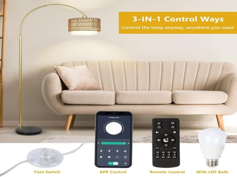 Dual Control via Remote or Foot switch: This gold floor lamp adopts a combination remote control and foot switch, assuring convenience for daily life. Adjust brightness, change colors or set different modes to DIY your desired lighting effect easily with just one tap on the remote or “Lamp Smart Pro” app without leaving the sofa and warm bed. The control range of the remote can reach 65ft, allowing you to adjust the boho floor lamps for living room without any hassle