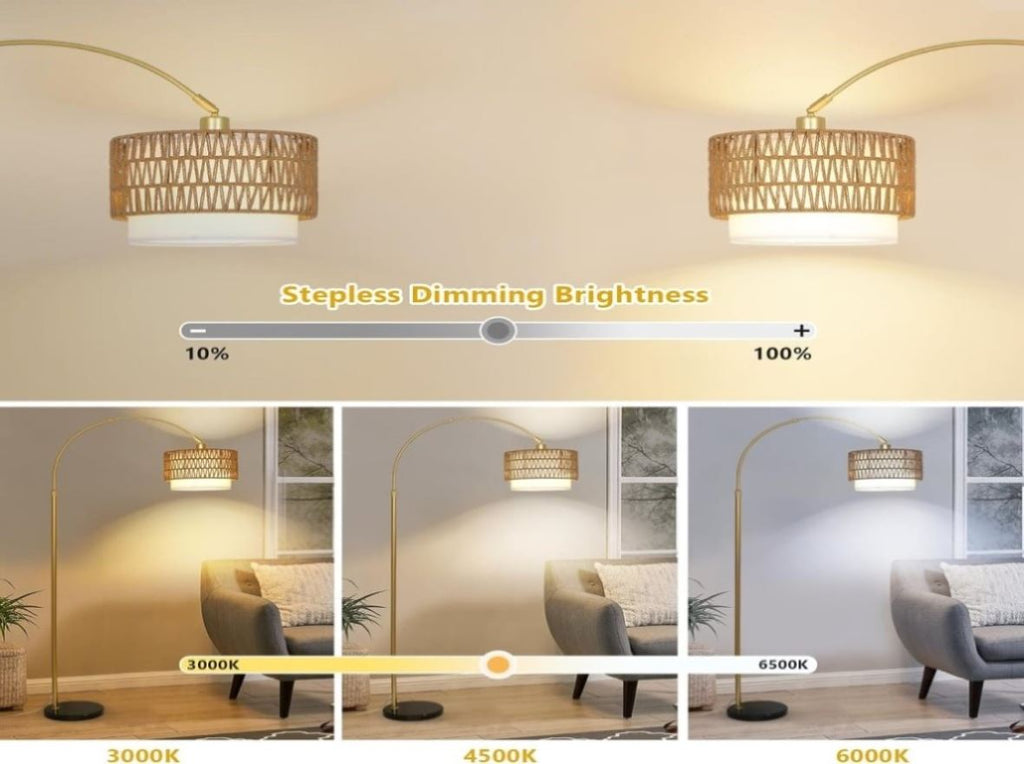 3 Color Temperatures and Fully Dimmable: The arc floor lamp for bedroom comes with a 9W LED bulb which supports stepless dimming of brightness (1%-100%) and color temperatures (3000K-6000K). With the remote, you can easily switch between 4 lighting modes (reading, feeding, working and night light modes) to meet your various scene needs. The timing function allows you to turn on and off automatically at a scheduled time, while the memory function can help you remember the last setting