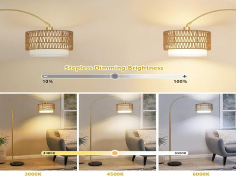 Arc Floor Lamp for bedroom with Rattan & Linen Shades, Gold Floor Lamp with Remote & Dimming Bulb, W2738P227439