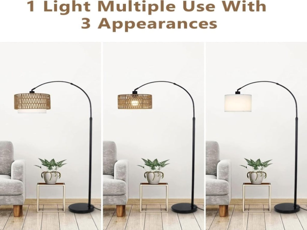 Standing Lamp with Double Drum Shade: Our farmhouse floor lamp comes with a hand-worked woven rattan and linen lampshade, has 3 display effects. Update the look of the LED floor lamp with remote at any time simply by combining the rattan and fabric lampshades; the 2 in 1 rattan and fabric shade design allows you to enjoy the diversity of home decor. Complemented with beige lamp shade, the light becomes soft, which can effectively protect the eyes and create a more warm atmosphere