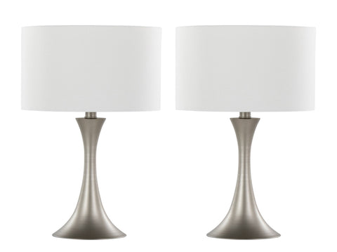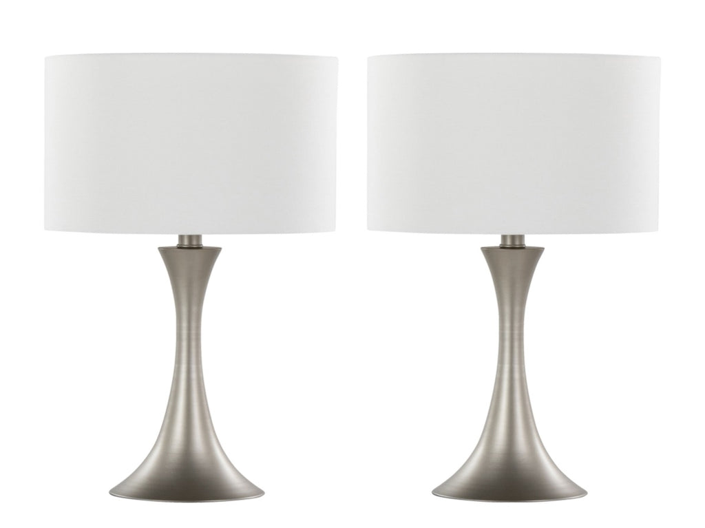 Add sleek modern style to your space with the Lenuxe Table Lamp Set from Grandview Gallery by LumiSource, which features a beautiful round base that elegantly curves up into a lovely hourglass body. Each lamp is topped by a metal finial and a drum shade, creating a lamp that is versatile yet stylish. Whether resting on your nightstands, set on a side table in the den, or tucked into your favorite reading nook, this lamp is a chic addition to any aesthetic.