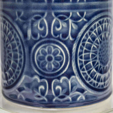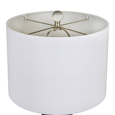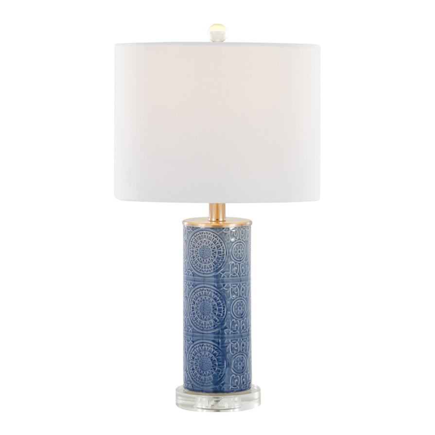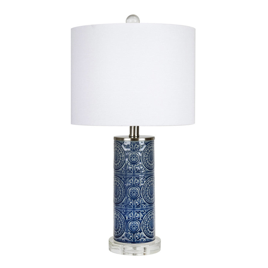 The unique Spyro Table Lamp from Grandview Gallery by LumiSource showcases a stylish ceramic cylindrical body featuring an embossed design atop a round slab of genuine crystal. It is crowned by a drum shade and crystal finial. Whether resting on your nightstand, set up in the living room, or styling up the office, this ceramic table lamp is the eye-catching solution to your lighting needs.