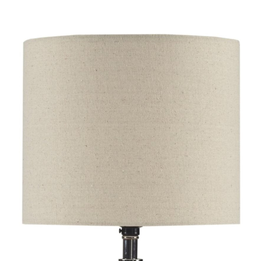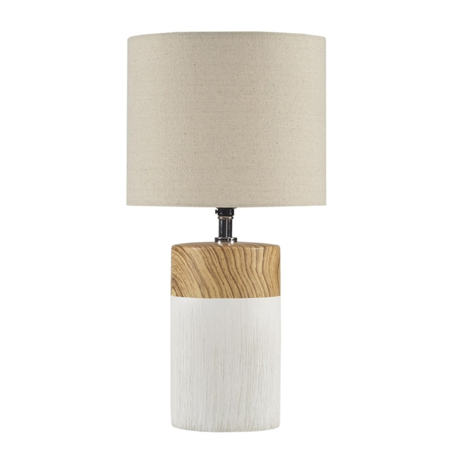Elevate your decor and illuminate your home with the contemporary style of the 510 Design Nicolo Textured Ceramic Table Lamp. This round table lamp features a two-tone ceramic base in white with a brown wood grain pattern to create a stunning modern look. The drum lamp shade softly filters the light to provide a warm ambiance in your space. Flaunting a simple, yet gorgeous design, this modern table lamp adds a sophisticated charm to your home decor. Handle with care. Spot clean only.