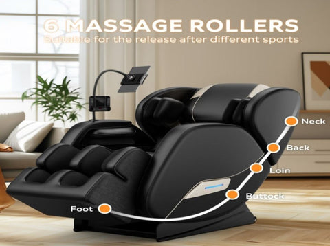 [Foot Relaxation] The massage chair features a retractable footstool, designed to adjust for different heights, ensuring a comfortable fit. The footrest incorporates a roller massage system that kneads the base of the feet, providing a soothing and relaxing experience. As the rollers spin, they stimulate key acupuncture points, while the integrated heating function for the legs promotes improved blood circulation and helps relieve tension in the leg and foot muscles.