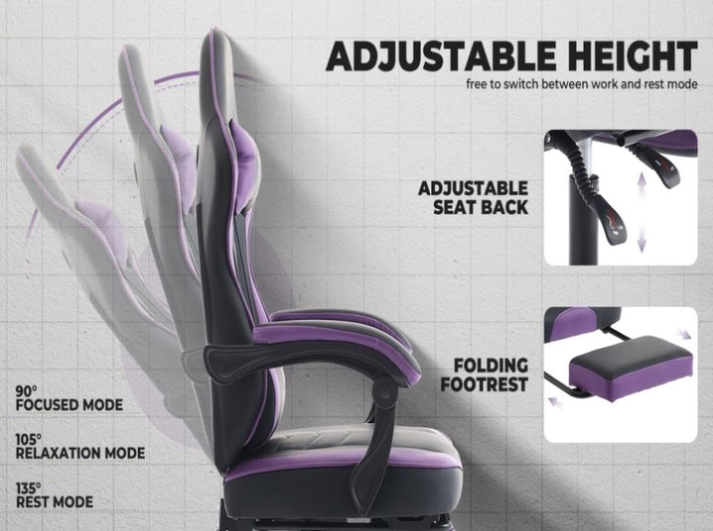 Versatile And Adjustable: The gaming chair includes an adjustable headrest, a seat height adjustment range of up to 4 inches, and retractable foot supports to meet the needs of users of different heights. The back of the chair can be adjusted to 90°, 105°, and 135°, so you can find the ideal Angle for work, play, or relaxation. The chair also has silent wheels to make the movement smoother and quieter for the best comfort experience