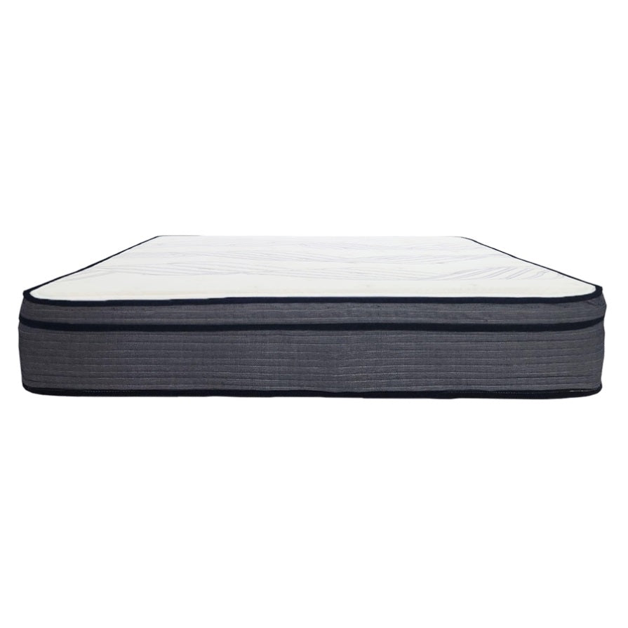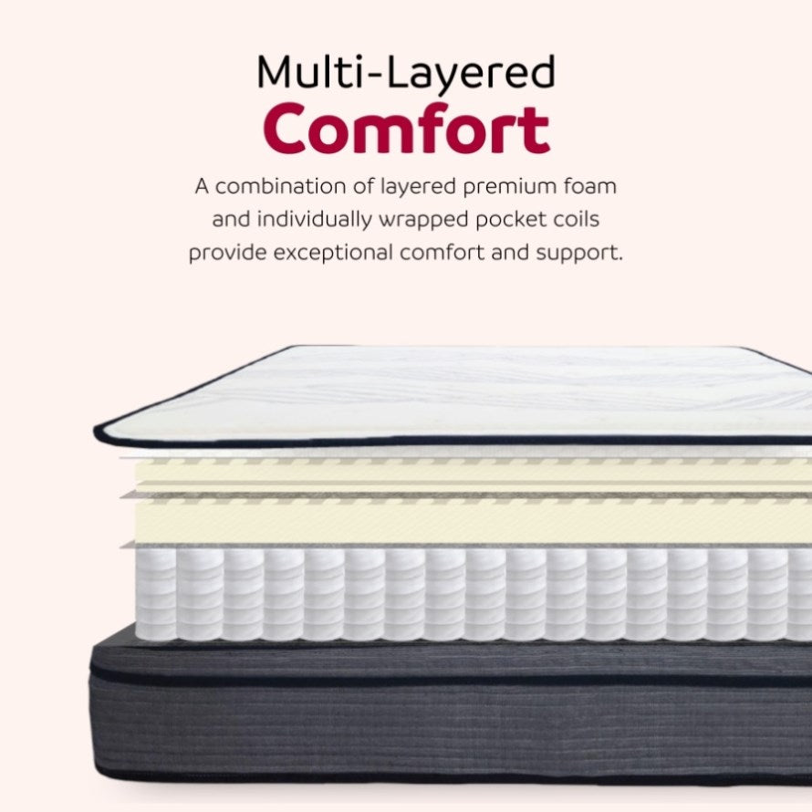 Transform your sleep into a rejuvenating experience with this 14 in. Pocket Coil Hybrid Mattress. Crafted for your comfort, it features multiple foam layers that cradle your body, relieving pressure points and ensuring night-after-night comfort. The foam layers enhance airflow, keeping you refreshed, while the independently wrapped pocket coil springs contours to your body providing targeted support where you need it most. Its elegant design, with a white knitted fabric, dark grey border, and stylish blue trim, adds a modern touch to your bedroom. Upgrade your sleep with this Hybrid Mattress for the perfect balance of comfort and support.