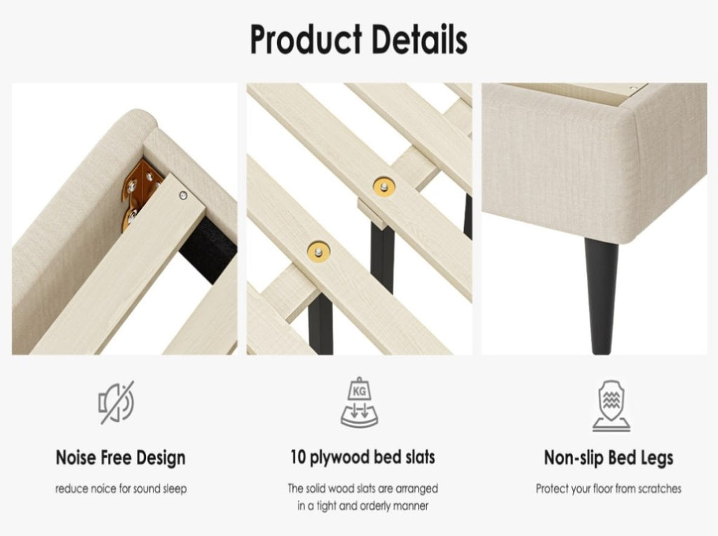 The wooden slats and center support legs have excellent load-bearing. Maximum load capacity up to 705 lbs. The bed frame is noiseless and equipped with plastic mats to protect the floor.