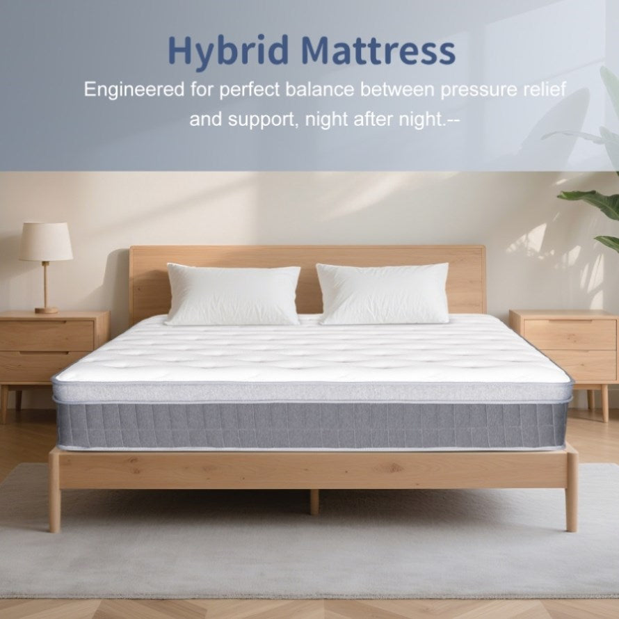 Built with a hybrid structure, this mattress features memory foam for pressure relief and contouring comfort; pocketed coils provide stable support and minimize motion transfer for undisturbed sleep; reinforced edges offer added stability and usable space near the perimeter; convoluted foam enhances airflow and helps maintain a quieter, cooler sleep surface; conveniently roll-packed for easy delivery and quick expansion, compatible with most bed frames.