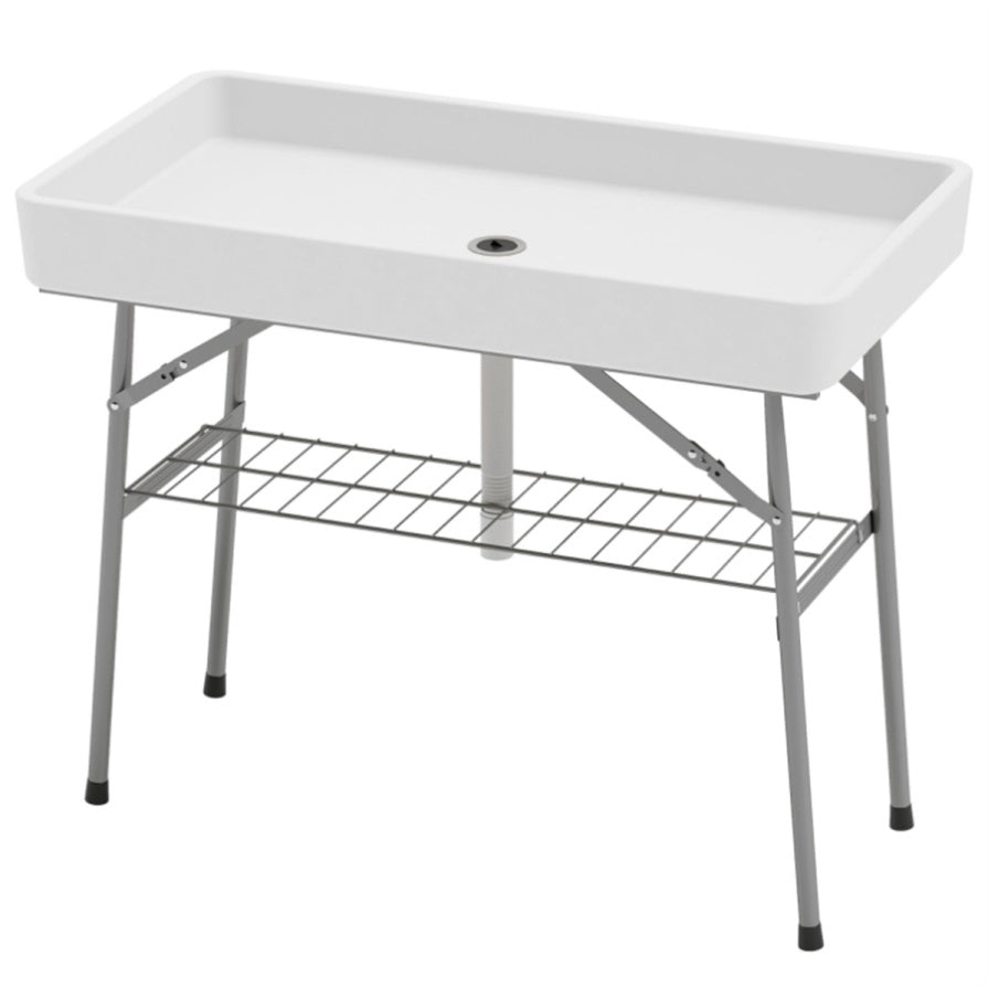 - - Ice cooler table includes drainpipe and an extra shelf for storage