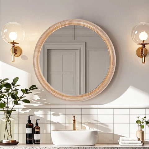 Distressed Vintage Wooden Look: Bring a charming, vintage-inspired touch to your home with this circular farmhouse mirror. The simple design, along with the beautifully distressed wooden frame, adds a timeless elegance that works as both a decorative piece and a functional mirror.