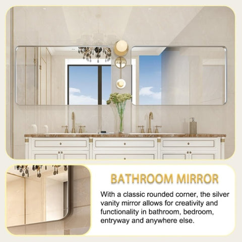 [Glossy brushed silver metal frame mirror] : The bathroom vanity mirror uses a high-quality aluminum alloy frame, which is rust resistant and does not deform. Practical rectangular mirror with rounded corners, simple classic clean lines, with modern and industrial style.