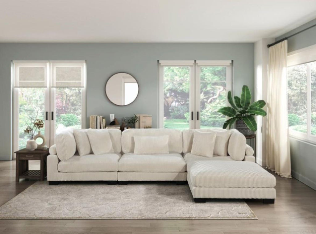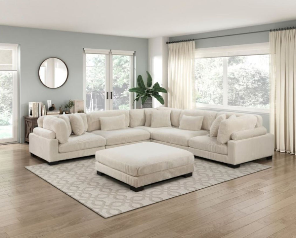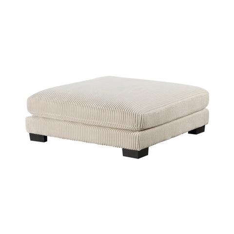 Configurable to your available space, the Traverse Collection allows for the addition and detachment of pieces for a customized seating experience. The plush beige corduroy fabric upholstery creates a plush expanse for a soft touch experience. The versatility in placement of the ottoman is left to your creative vision, using it as a stand-alone unit or part of a larger configuration.
