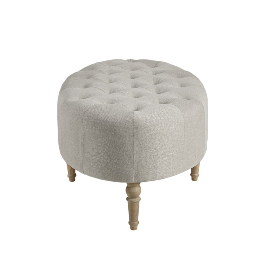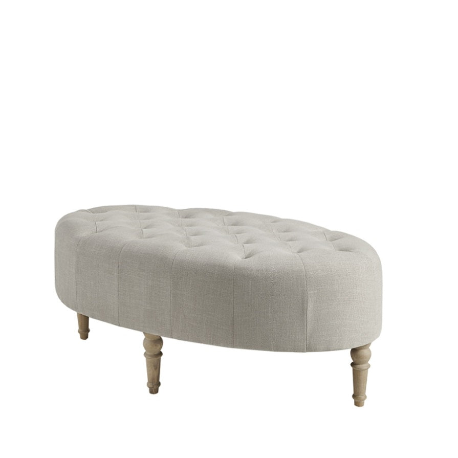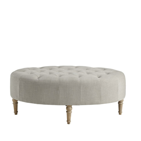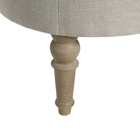 Created exclusively for the Martha Stewart Bedford furniture collection that embodies country farmhouse living, complete your living space with the Clara Accent Ottoman. This oval ottoman is upholstered in a linen-hued fabric and features a button-tufted top that adds an elegant accent to the design. The solid wood legs screw in and showcase a reclaimed natural wood finish to complement the upholstery, creating a farmhouse-inspired look. At her country farmhouse, Martha enjoys bringing the outdoors in. This functional and practical lifestyle is evidenced in her thoughtfully appointed decor which embraces a neutral color palette that acts as a perfect backdrop to four seasons of color. Leg assembly required.