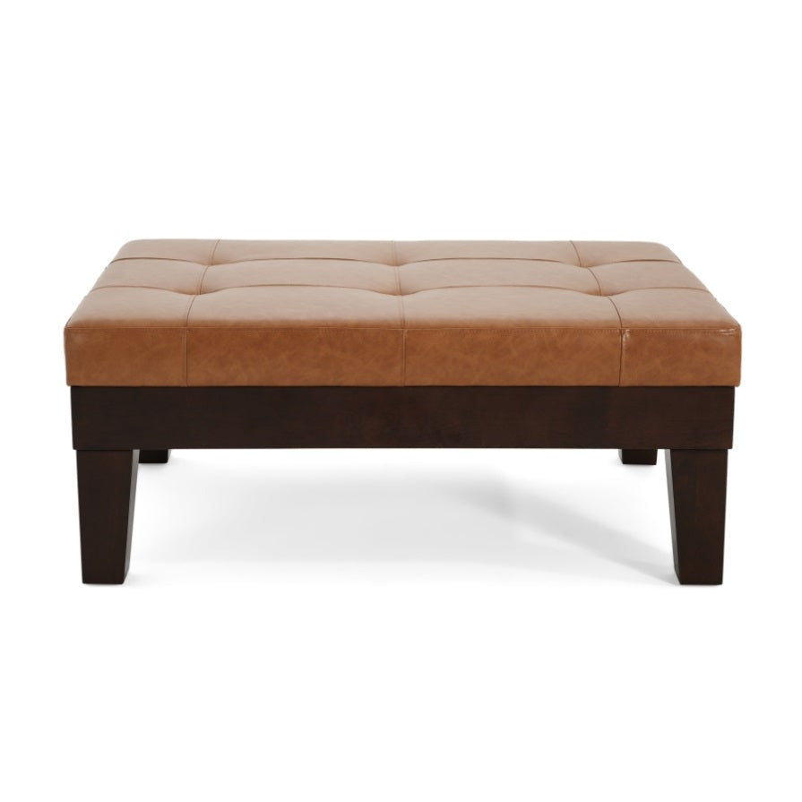 This storage ottoman features square tapered hardwood legs that protect your floor and add style with their stately color and a hidden slide-out drawer. Designed with inviting brown bonded leather, the ottoman will compliment any loveseat or sofa.