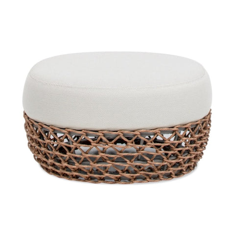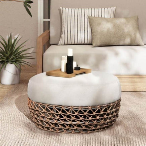 Willow 25" Round Upholstered Woven Patio Ottoman, Golden Brown Wicker Frame, Wheat Beige B2719P305701