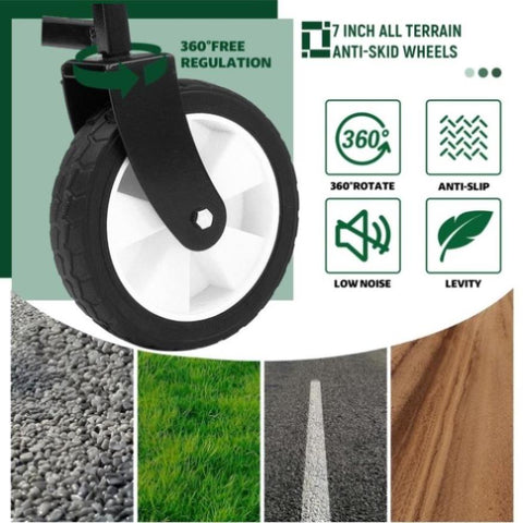 All-Terrain 360-Degree Swivel Wheels: Equipped with 7-inch wheels that can rotate 360 degrees, this cart is perfect for navigating various terrains, making it easy to maneuver on any surface.
