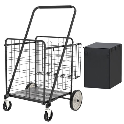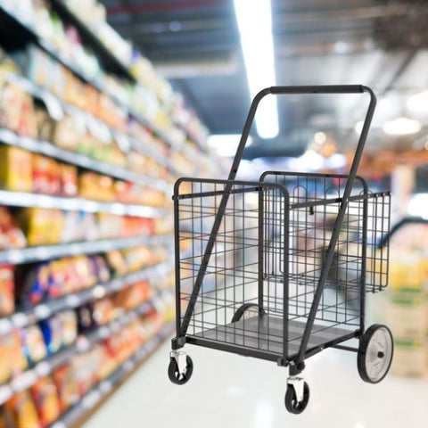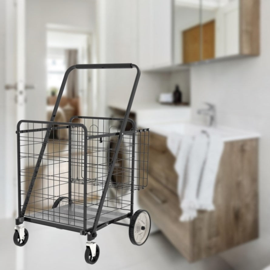 360 Swivel Wheels: The 360-degree swivel front wheels make maneuvering the shopping cart incredibly easy. The oversized rear wheels are durable and made of rubber, resisting wear and reducing noise.