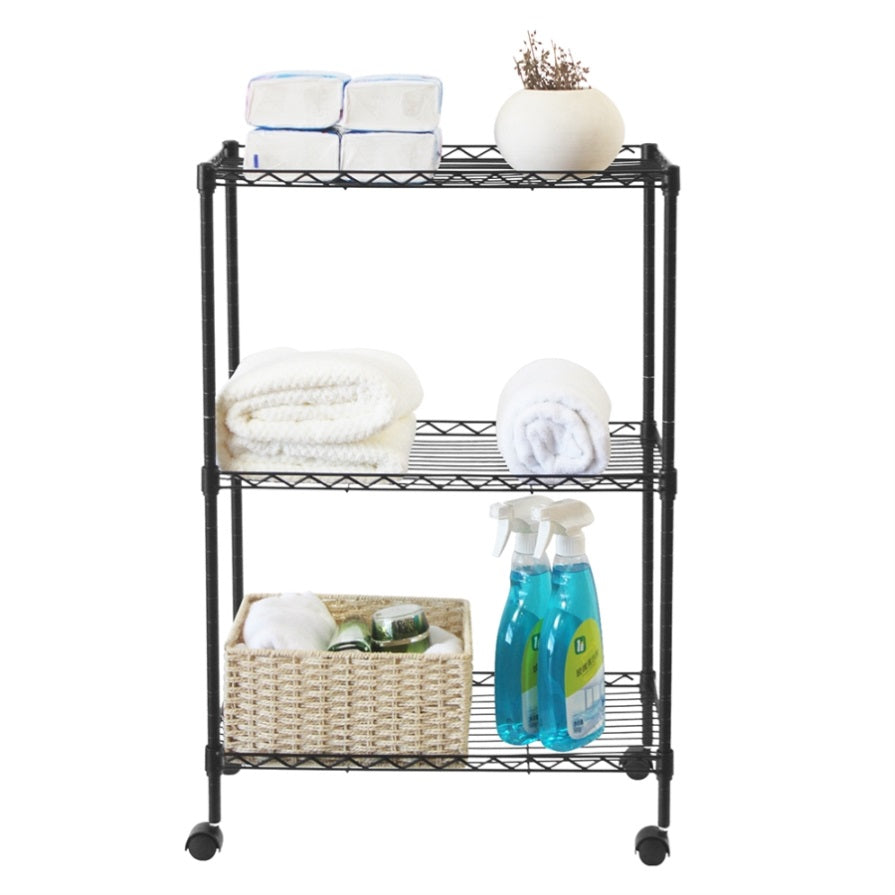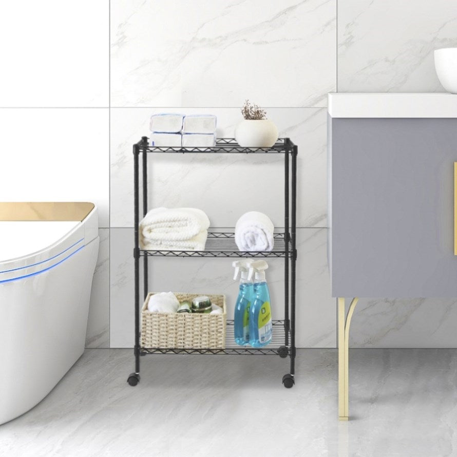 Organize your home, laundry room and work space effortlessly with the  3-Tier Shelving All-Purpose Utility Cart. Made with chrome plated steel, the utility cart is ideal for any environment as the casters provide convenience of transporting objects with ease. Each shelf can hold up to 150 lbs and the raised borders on the shelves keep items intact without falling or rolling off. The shelves are height adjustable to provide versatility to accommodate the size of the objects. The 3-Tier Shelving All Purpose Utility Cart is the perfect addition to any home, laundry room or work environment.