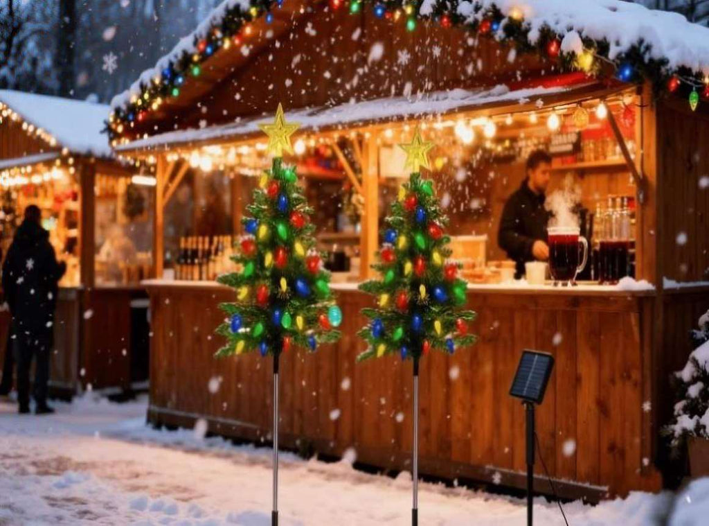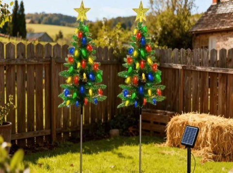 • Exquisite Tree Lights With Christmas Ornaments: 2Pack solar-powered Christmas tree lights(each height is about 37.4in) imitate real pine tree, creating a realistic and rich holiday atmosphere. Adorned with a variety of cute and gorgeous accessories, including stars, bows, bells, and vibrant colorful balls, allowing for customizable decoration to suit personal taste.