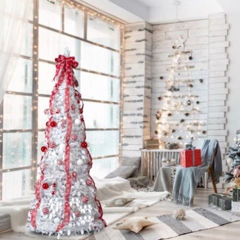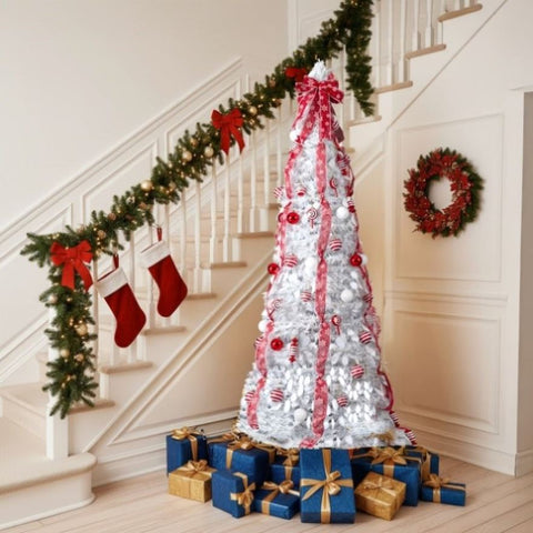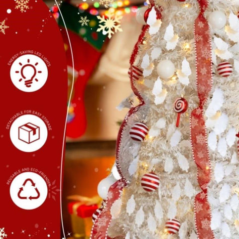 1. Fully Decorated: This fully decorated pop-up Christmas tree takes the stress out of holiday decorating. With its lifelike branches adorned with various styles of balls, white leaves, twinkling fairy lights, candies and ribbons, it brings festive magic to your space in seconds—no additional decor needed.